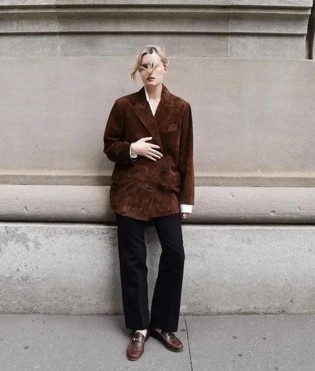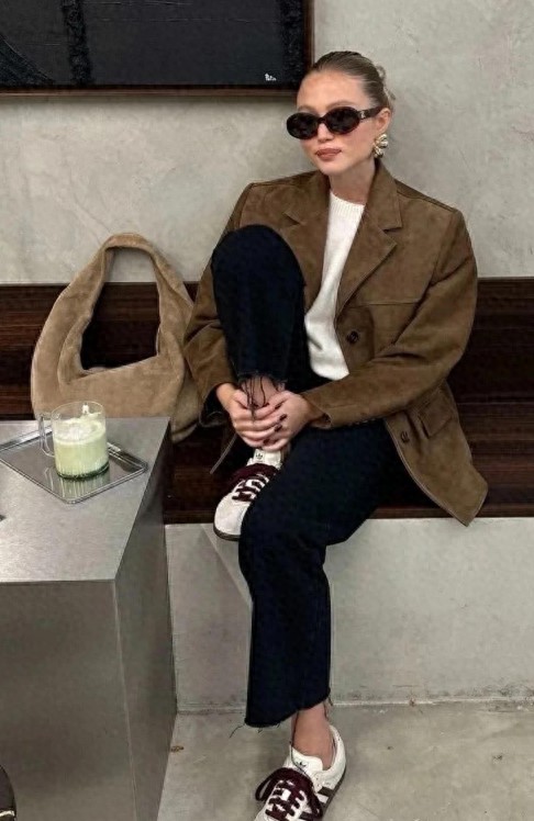 呢子西装外套和小香风款式的搭配,适合更加公式化的上班及休闲场合。