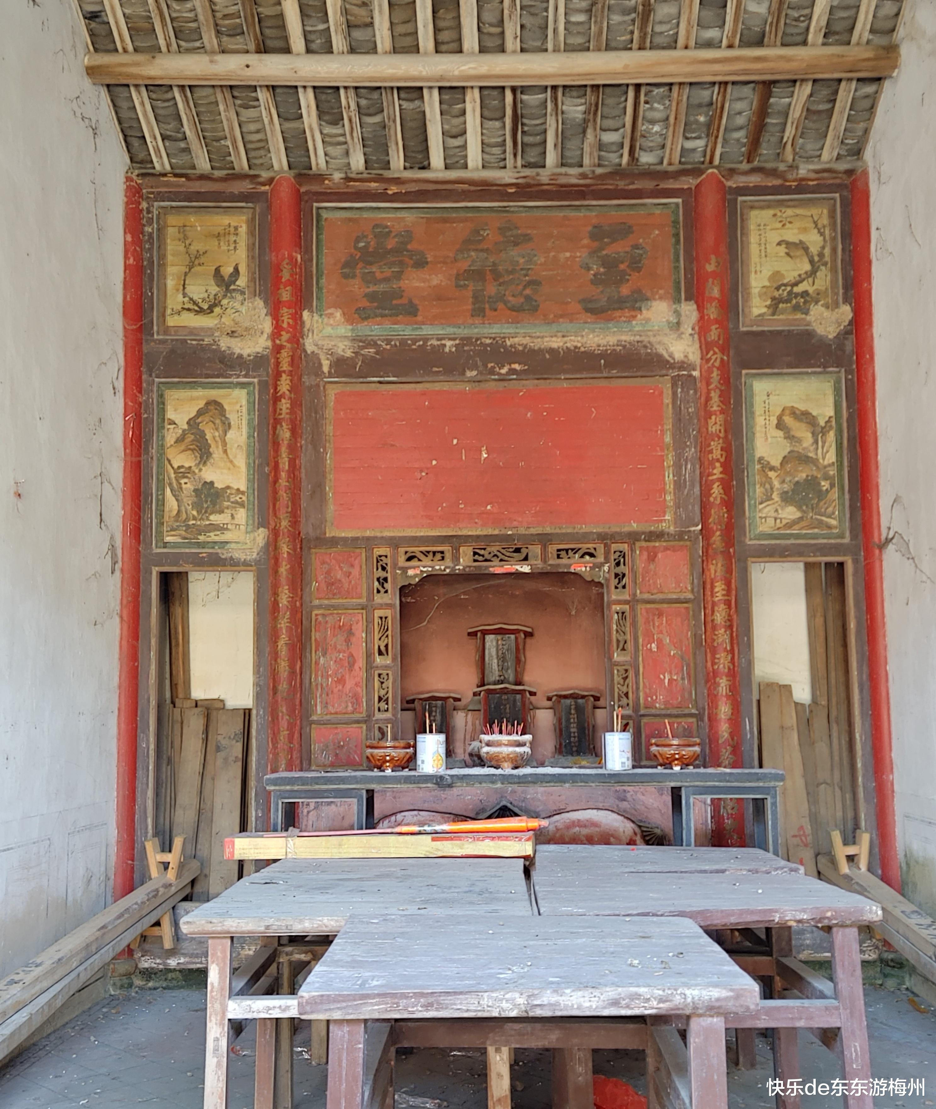 上堂柱联的两侧各有两幅摹古笔法的彩色壁画,上面两幅为花鸟图,下面两幅为山水画。四幅画作笔法老道,耐人寻味。从落款可知,壁画为民国卅一年(1942年)壬午岁季春三月梅县知名的民间画师嘉翔(号学文)所画。