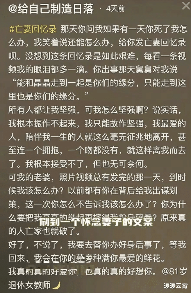 仅仅十几天后,一个账号开始以视频日记的形式,连载《亡妻回忆录》。镜头前,男人深情追忆与妻子从相遇、相爱到结婚生子的每一个细节。