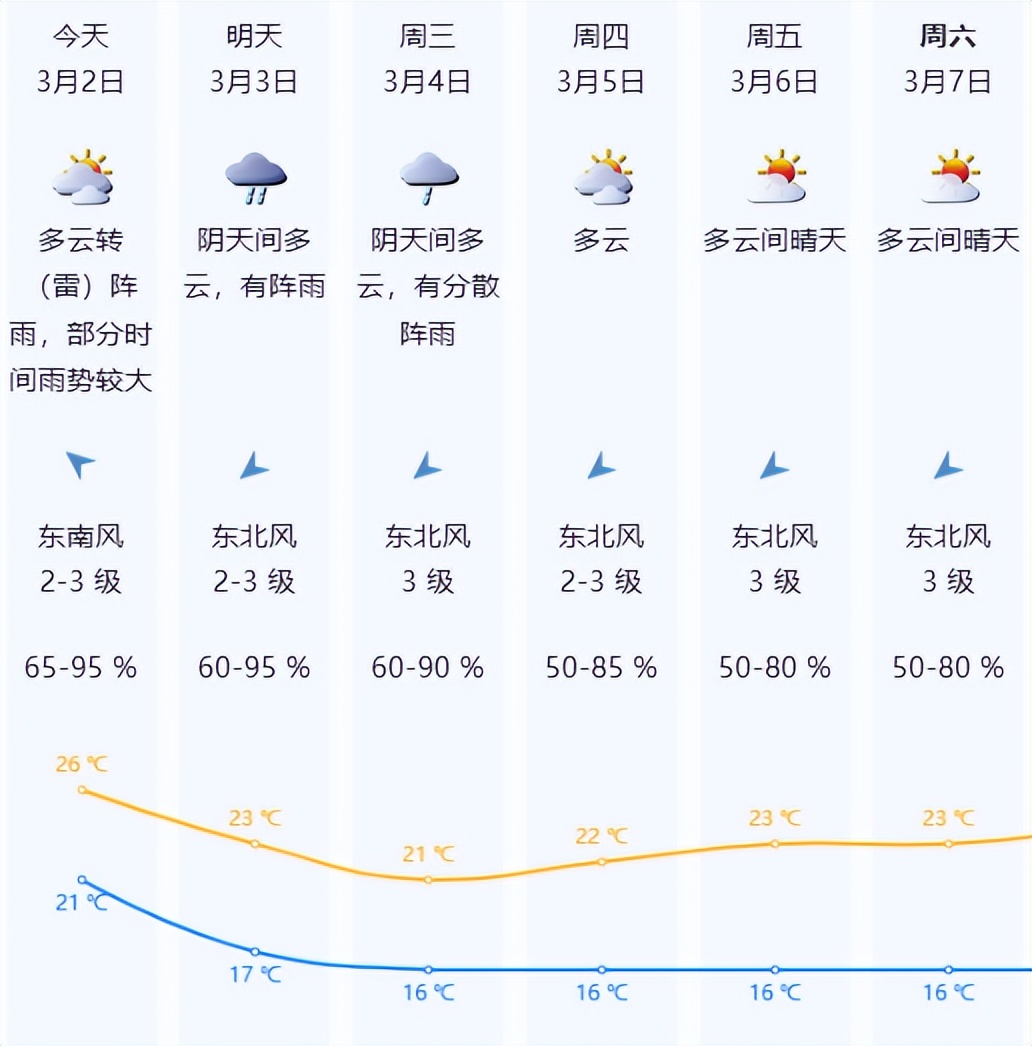 预计,2-3日,广东有中到大雨局部暴雨,部分市县伴有弱雷电、短时强降水和6-8级短时大风,4日降雨明显减弱。另外,2-3日,受冷空气和降雨共同影响,我省中北部市县日平均气温下降4-6℃,南部市县下降3-4℃。海陆交通注意安全。春季气温多变,注意适时增减衣物,预防呼吸道感染等疾病。