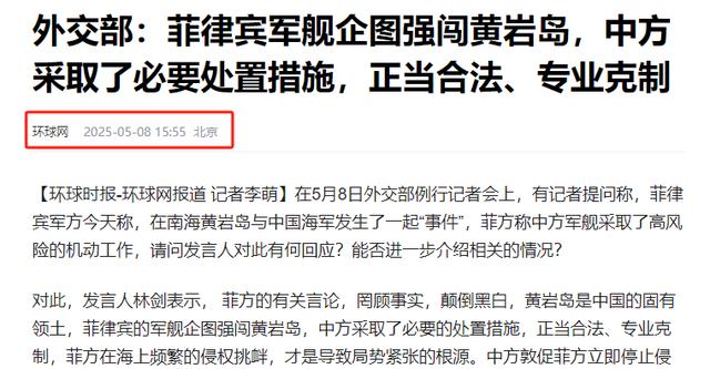 信源:环球网 2025年5月8日 关于“外交部:菲律宾军舰企图强闯黄岩岛,中方采取了必要处置措施,正当合法、专业克制”的报道