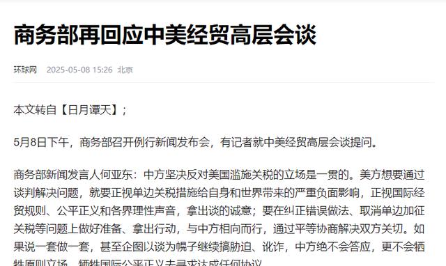 信源:环球网 2025年5月8日 关于“商务部再回应中美经贸高层会谈”的报道