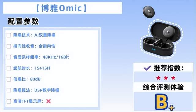 作为博雅中端主力款,凭借强降噪能力,成为中阶创作者的刚需设备。核心亮点在于强降噪与稳定传输:搭载DSP降噪芯片+AI智能降噪算法,针对户外风噪、车流杂音精准压制,人声还原度达98%,复杂环境下收音依然纯净。48kHz/24Bit高采样率+宽频响应技术,音质细腻通透,细节捕捉精准,达到准录音室级别。传输采用2.4G数字传输技术,150米可视距离稳定连接,抗干扰能力强,延迟低至25ms,直播音画同步流畅。续航方面,发射器单次续航9小时,充电盒总续航27小时,支持快充。兼容手机、相机、电脑,支持一拖二双人收音,配备实时监听接口与安全音轨,新手也能精准把控收音质量,是中阶创作者的高性价比选择。