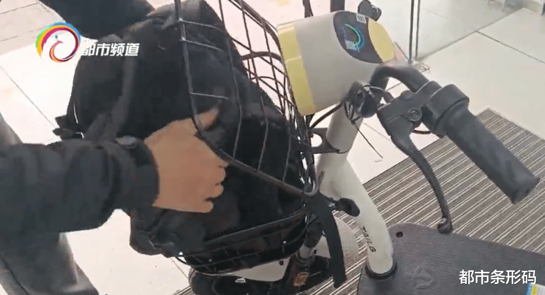 双座版的车型,电池是安装在踏板处的,而置物空间则是车头的这个小篮子,记者尝试把随身背着的双肩包放进去,尴尬的一幕出现了。