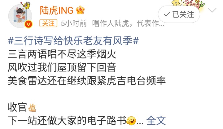 那么,陈楚生等艺人,在快乐老友记短暂分别后,未来再聚,究竟有怎样的心愿表达呢?张远在社交平台发文:“远房”的门永远向大家敞开。诗情画意般的表达,不由得让人想起,张远在《快乐老友有风季》里的精彩表现!亮明才艺,上演综艺互动!陆虎这样写道:“三言两语唱不尽这季烟火”。