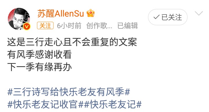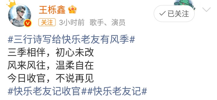 王栎鑫三行诗写给快乐老友有风季!一句“今日收官,不说再见”,道明艺人的心声!毕竟,这一期综艺节目结束了,但是每一位参与其中的艺人,真情还在!正如苏醒写的那样:“下一季有缘再办”。那么,《快乐老友有风季》收官以后,什么时候又可以看到,再就业男团艺人一起参与其中的综艺呢?大家正在拭目以待!