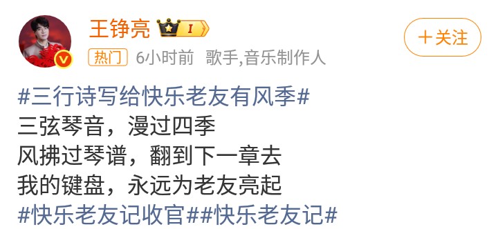 由此可见,陆虎参与此次综艺节目演出,有太多想说的话!这就是再就业男团艺人综艺情怀的表达!王铮亮发文:“我的键盘,永远为老友亮起”。这就是王铮亮的艺人情谊!《快乐老友有风季》综艺,将再就业男团艺人聚到一起。每一位艺人参与其中,秀出各自的才艺,升华彼此的友谊,带给观众更多的快乐与惊喜!