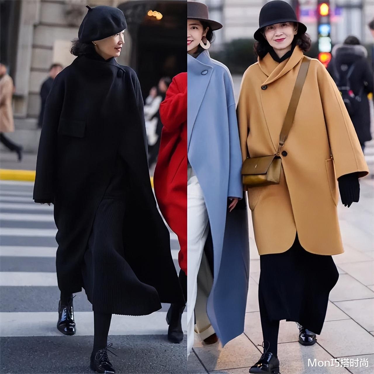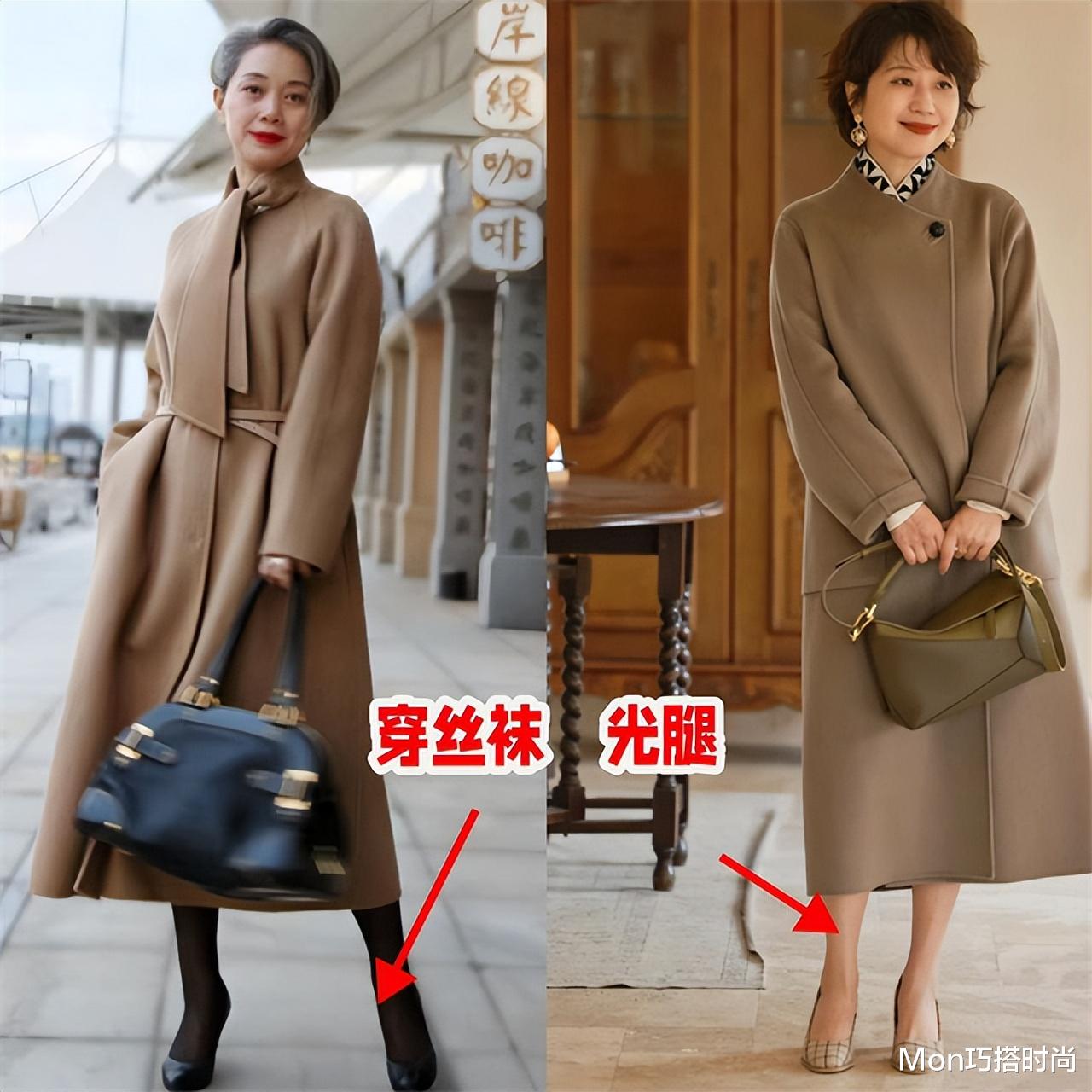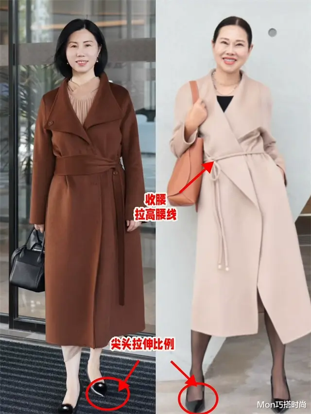 看这些中年女人的搭配,选择长款大衣再配合高跟鞋,拉伸了比例,会显得身材很高挑,此时再加上露出小腿和脚踝的肌肤,也能够更好地营造出一种轻盈利落的感觉,显得整个造型都洋气了不少,丝毫不沉闷哦。