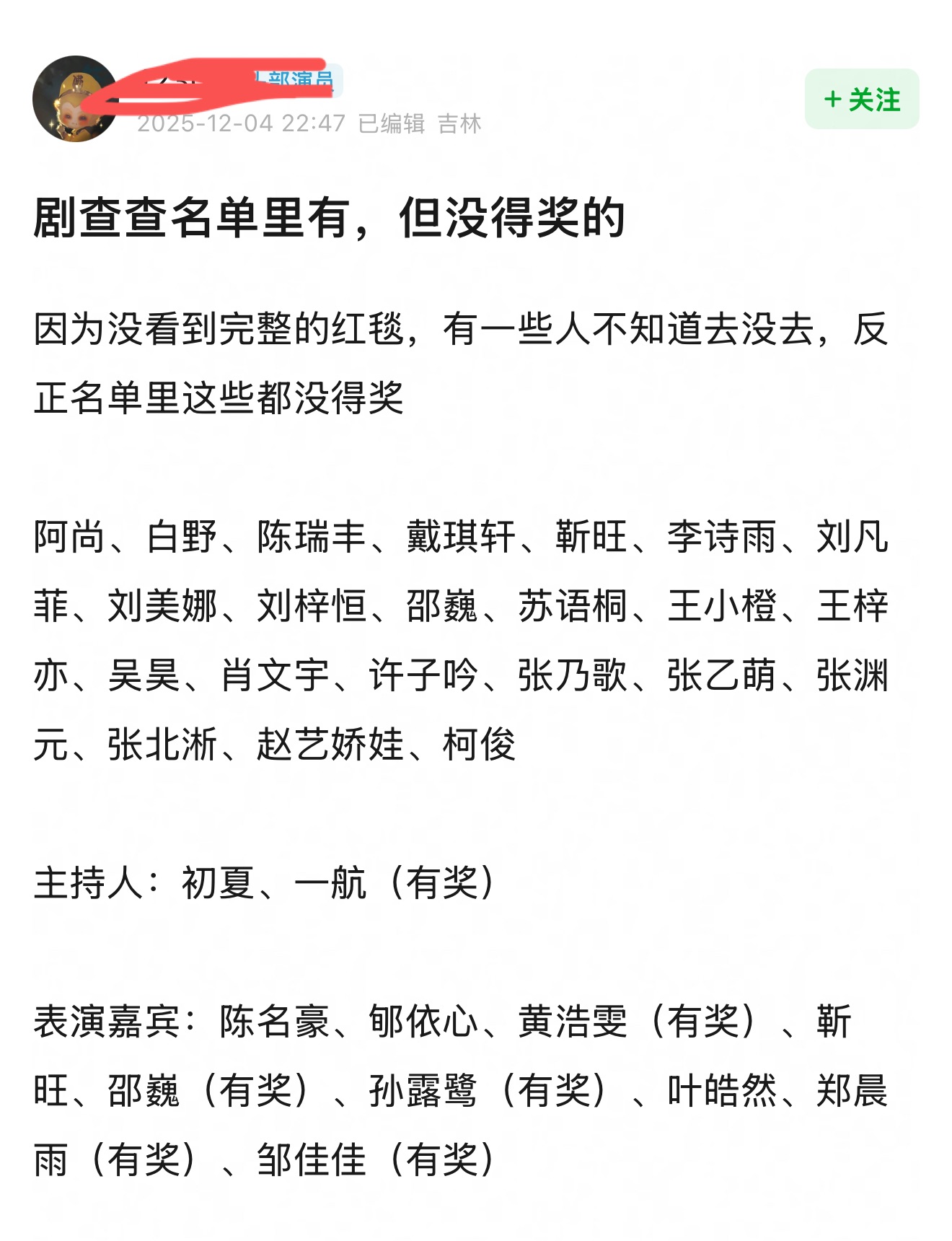 到场了但没有分到奖项的不在少数,包括阿尚、陈瑞丰、戴琪轩等。