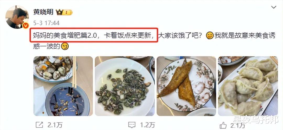 而另一边呢,黄晓明则是晒出了妈妈亲自烹饪的美食。