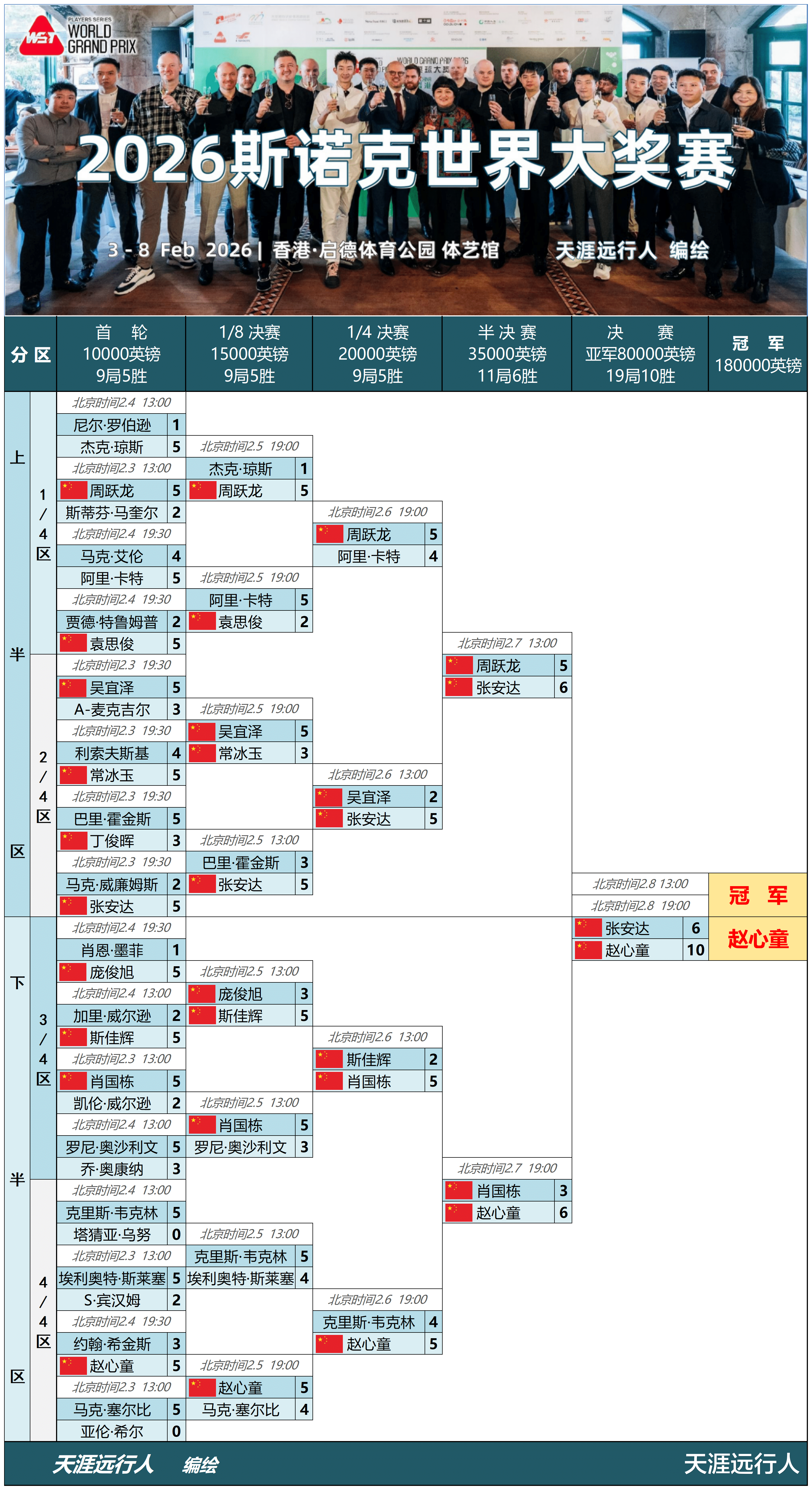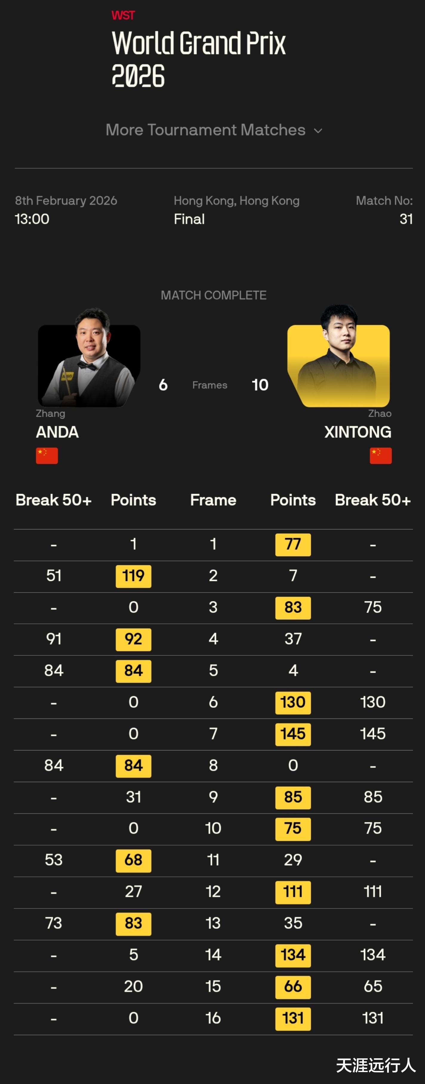 再就是2026世界大奖赛,赵心童10-6张安达的这一场。