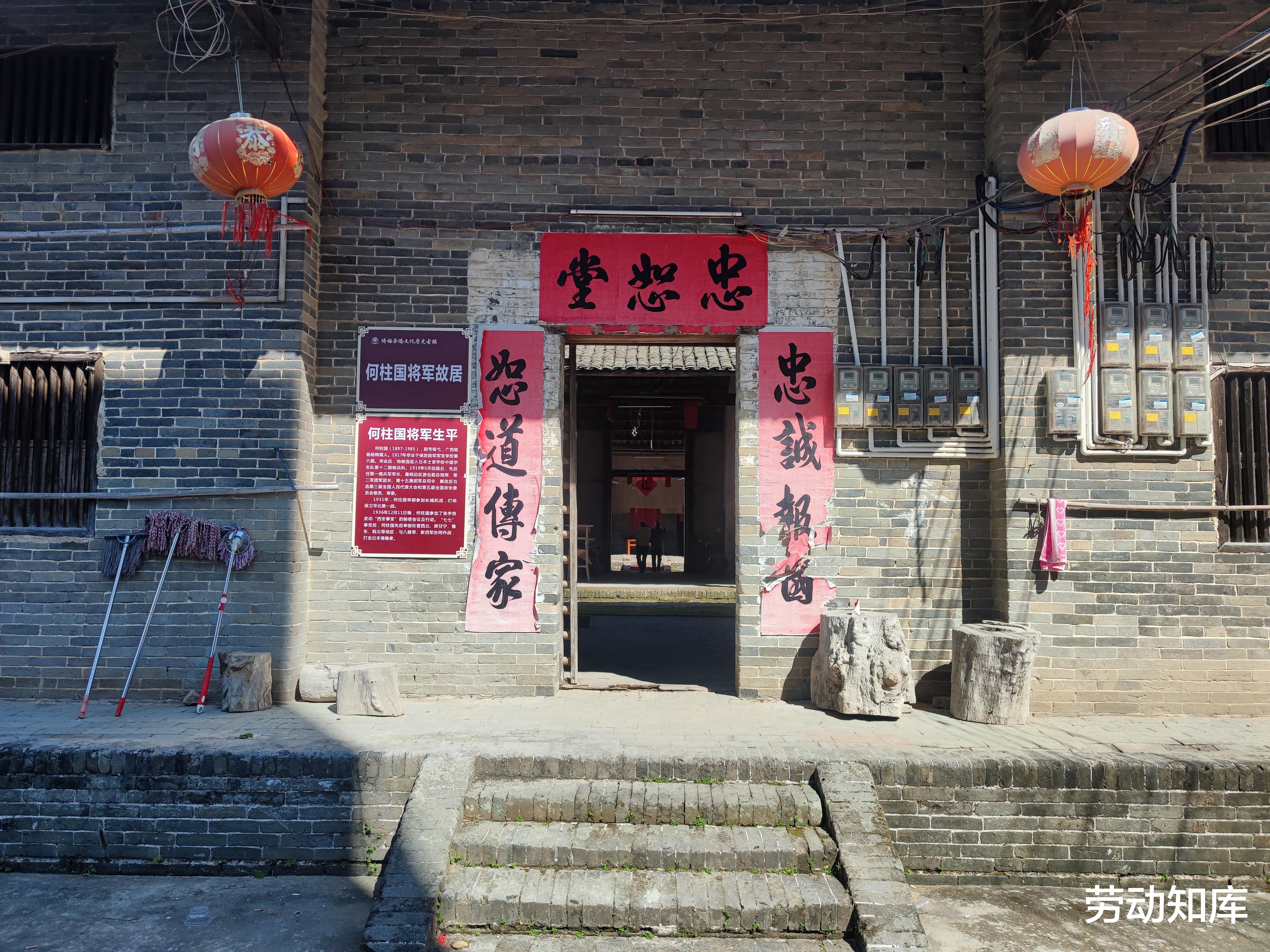 从杨梅镇绿荫城门马路对面走入,沿着巷子步入成美村,何柱国祖居 "忠恕堂" 便映入眼帘,堂号 "忠恕" 或取自《论语》"夫子之道,忠恕而已矣"。这座始建于民国二十年代的宅院,采用典型的岭南民居格局,四进厅堂依次递进,单横廊连通各房。尽管以坭砖为墙、青瓦覆顶,却在简朴中透出庄重。故居门联上书“忠诚报国,恕道传家”,也暗合何柱国一生的处世准则。