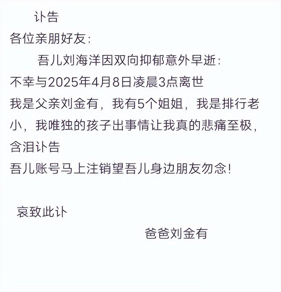 2025 年 4 月 8 日凌晨三点,郑州郑东新区某小区天台上,26 岁的刘海洋纵身一跃。这个在朋友圈晒着健身照、演唱会门票和云南旅行视频的 "人生赢家",最终选择用最决绝的方式告别世界。他的父亲刘金有在讣告里写下:"家里啥都不缺你的",却不知道这句话像一把刀,扎进无数网友的心。
