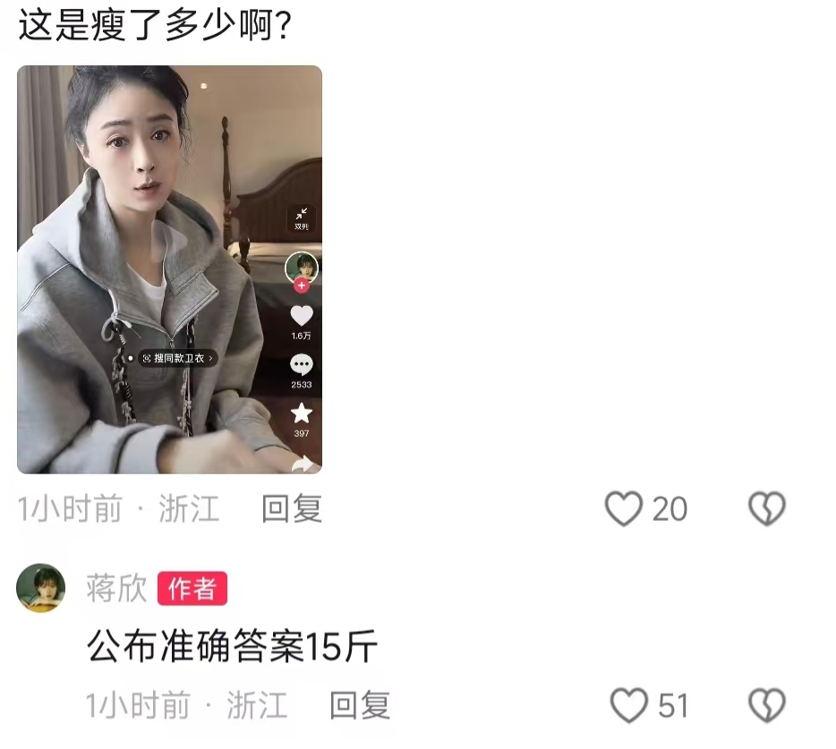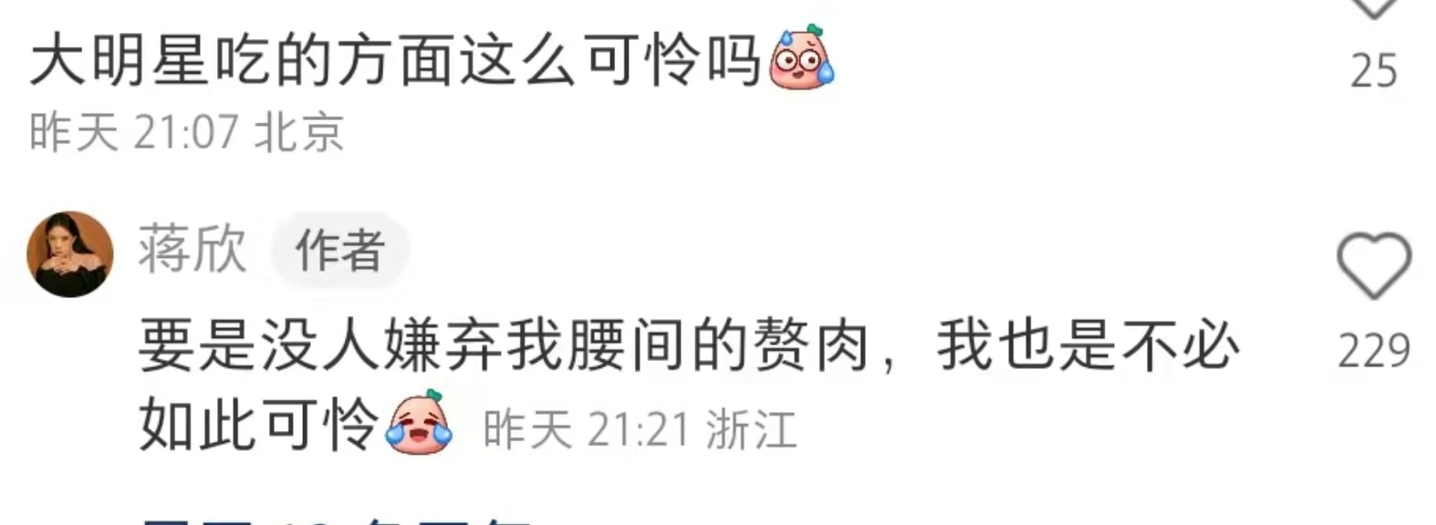 随后,蒋欣现身评论区,并与网友们互动。当有人留言打趣蒋欣偷吃蛋糕的过程时,蒋欣本人回复道:“800个心眼子”,超好笑。而有人询问蒋欣“大明星吃的方面这么可怜吗”,她则回复称要是没有人嫌弃她腰间的赘肉,她也不必为了口吃的如此可怜。减肥于普通人而言就不容易,对于明星而言就更不容易了。