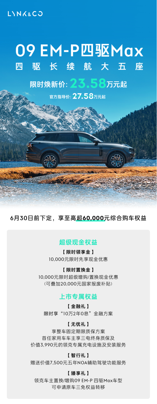 领克09EM-P大五座以27.58万元起官方指导价上市,限时焕新权益价23.58万元起。该车型通过空间重构、续航突破与安全配置的全面升级,精准契合家庭用户对全场景出行的核心需求,以全能产品力重塑中大型新能源SUV市场格局,为消费者提供兼具豪华品质与实用价值的出行解决方案。
