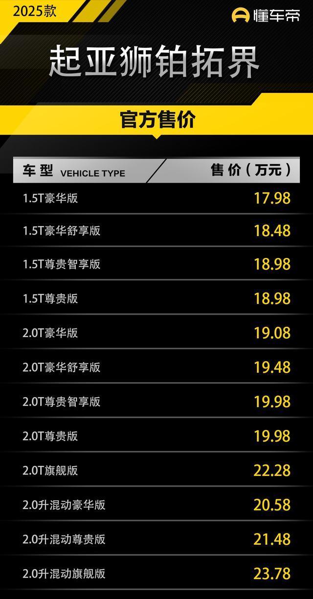 全新狮铂拓界的基础配置相当丰富,包含了自动紧急制动、车道保持辅助、倒车影像、前后雷达、巡航控制、前排智能进入、自动头灯、前排隔音玻璃、自动空调和后排出风口等实用功能。而高配版本则更进一步,增加了行人穿行预警、真皮座椅、前排座椅加热和通风、后排控制键、哈曼卡顿8声道音响系统以及多色车内氛围灯等高端配置,为驾驶者提供更舒适的驾乘体验。