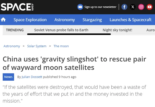 2025年5月9日,美媒发布了一则消息说——中国利用“重力弹弓”救援一对失控的月球卫星,这是什么情况?什么月球卫星?