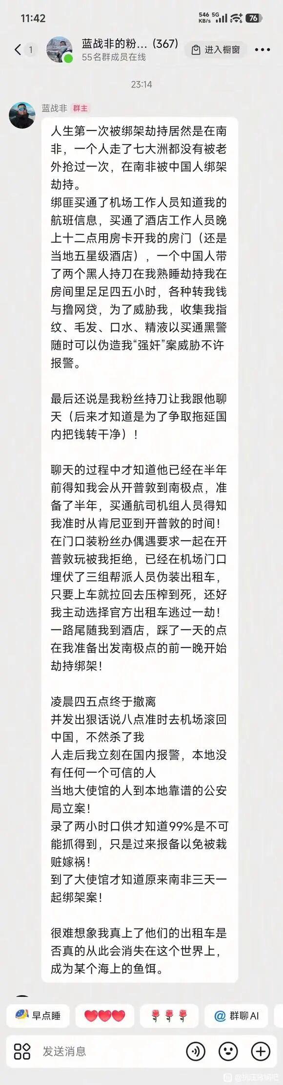 千万粉丝网红蓝战非爆料,自己在南非被中国人绑架,绑匪提前半年谋划,买通多方人员,手段恶劣。