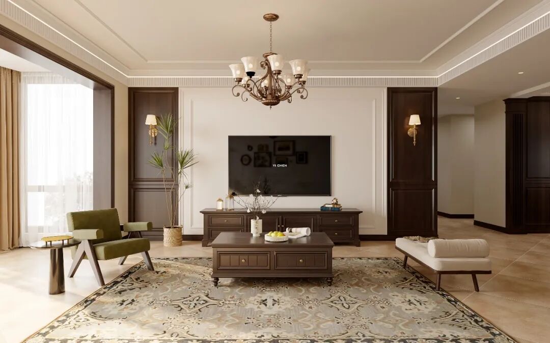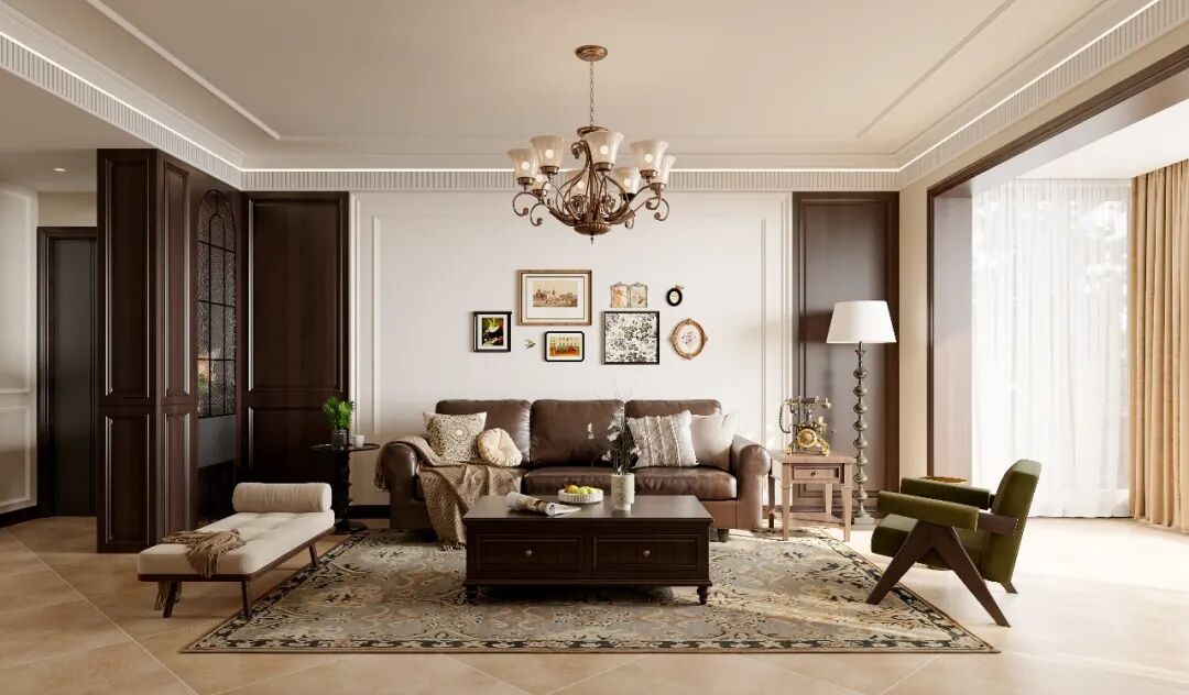 复古吊灯悬于空,光漫过沙发与茶几