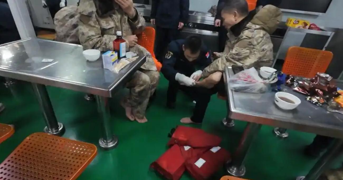 救护组迅速上前检查处理冻伤,官兵们递上御寒衣物,炊事班送上温热的姜汤热饭,政治军官安抚情绪、协助联系家人报平安。