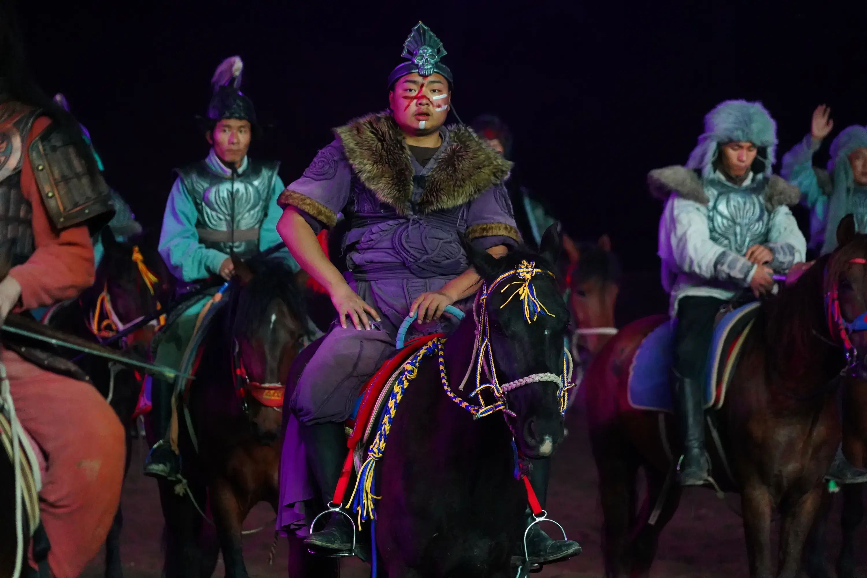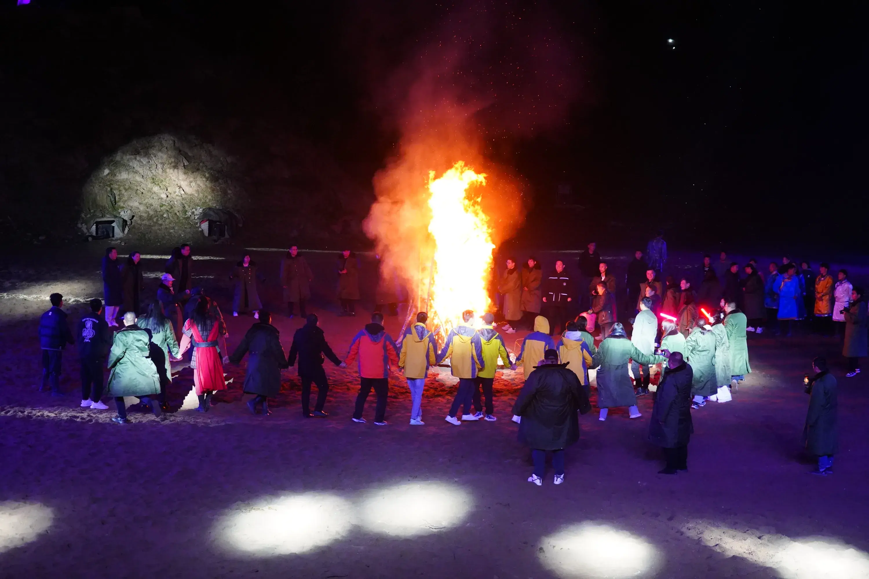 实景剧后的篝火晚会才是今夜气氛的高潮。堆木成垛,远方来客点燃篝火,和牧马人、和马战剧演员、和游客和在场的所有人共同起舞,此刻在草原上没有陌生人。