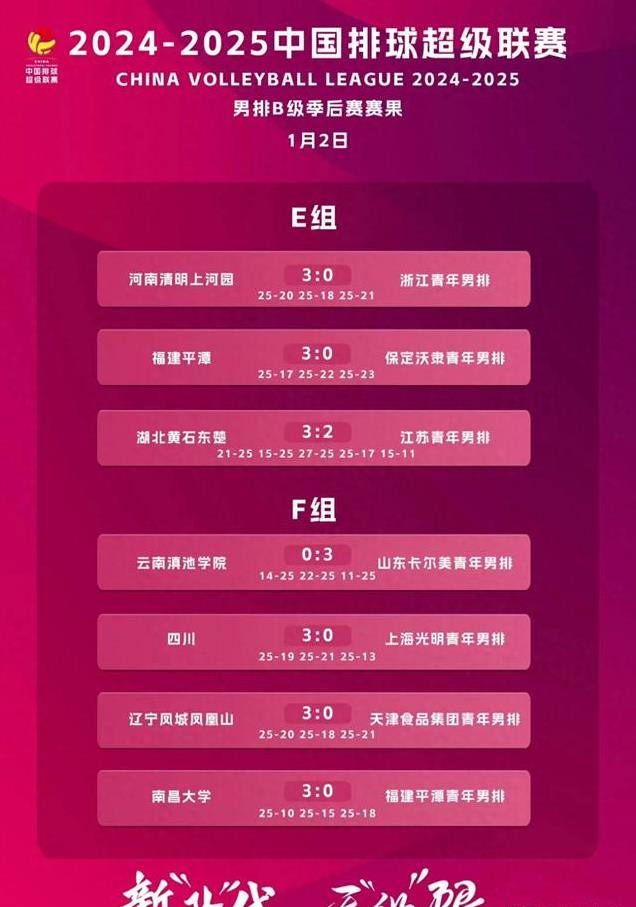 12月31日,2024-2025赛季中国男排超级联赛B级季后赛第一阶段第16轮争夺结束。在征战B级常规赛的球队和青年队的交手中,云南大学滇池学院0-3不敌山东卡尔美青年男排。本轮赛果如下: