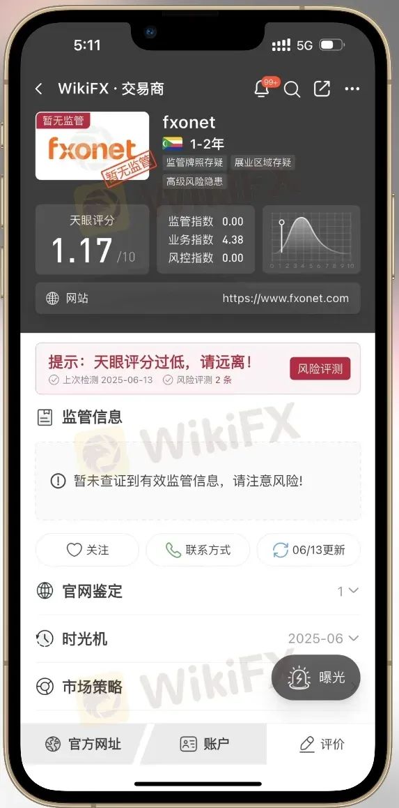 外汇天眼收录fxonet(评分1.17)和FXONET LTD(评分1.23)平台,实际同属于Fxonet Ltd,fxonet.com做经纪业务,另一个仅仅是宣传公司不开发业务。