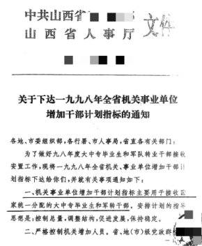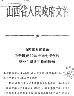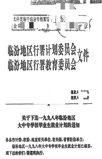 《山西省委组织部、省人事厅关于下达1998年全省机关事业单位增加干部计划指标的通知》,其中下达到临汾地区共计2286个就业指标,明确说明该文件下达的干部计划指标是为承接1998年全省统分大中专毕业生安置预留的编制与身份指标,核心服务于当年山西省大中专毕业生(含统分中专生)的就业安置,是地方落实毕业生统分政策的重要指标依据。文件明确要求:“各县市须严格按照省级下达的干部计划指标完成统分大中专毕业生的岗位安置,不得超指标或无指标安置,也不得截留指标拒不落实”,不得将增干指标挪作它用”。
