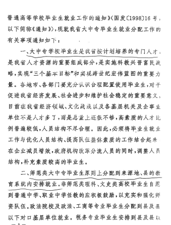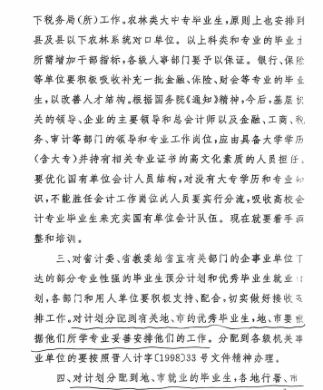 《山西省人民政府关于做好1998年大中专学校毕业生就业工作的通知》,1.大中专学校毕业生是我省按计划培养的专门人才。2.师范类大中专毕业生原则上分配到生源地、县的教育系统内安排就业。3.对回生源地就业的毕业生,当地政府要确保其就业岗位落实,不得随意将其推向社会。