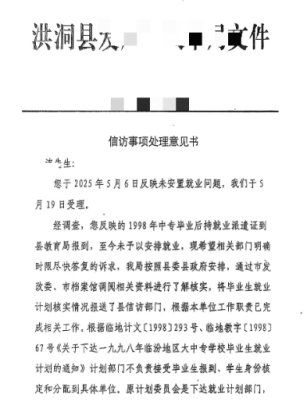 从20岁出头到年近半百,27年来梁洪峰始终坚持维权,多次奔走于政府、信访、教育、发改等部门,只为维护自身合法就业权益。令人难以接受的是,2020年相关部门已核实其身份及安置资格,却在5年间未予实质性解决,远超《信访工作条例》规定的办结时限。洪洞县多部门在确认其符合政策后,却未主动履职,现申请政府信息公开,要求洪洞县教育部门出具1998年派遣回洪洞县报到的中专体育类毕业生分配名单及人员档案,核查10个指标的具体分配人员与岗位,恳请其上一级行政机关出面协调督办。