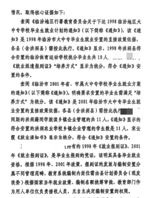 此后,洪洞县发改部门调阅资料核实,依据1998年临汾地区相关就业计划文件三次作出说明:原计划部门只是就业计划的下达部门,不负责毕业生报到分配,且当年已完成计划编制工作;上级下达就业计划仅标注学校、专业、学历、培养方式、就业单位、人数等信息,无学生姓名,名单由接收毕业生报到单位掌握,就业计划执行也是由毕业生报到单位负责。事实清晰,两部门岂能看不懂临汾行署下达的指令性文件?