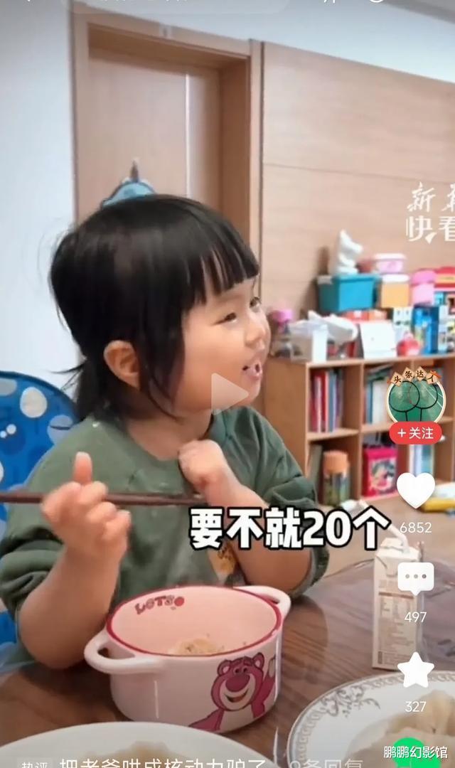 妈妈煮熟饺子后,小棉袄对爸爸的成果极为满意,提议道:“往常吃10个,这次吃20个如何?”她以实际行动赞扬爸爸,让爸爸深感欣慰。