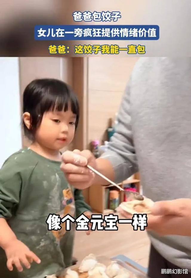 闺女帮忙擀皮,上衣沾满白面,却异常专注。见爸爸包饺子手法娴熟,饺子形态可爱,她忍不住夸赞:“这像金元宝,您要发财啦!”