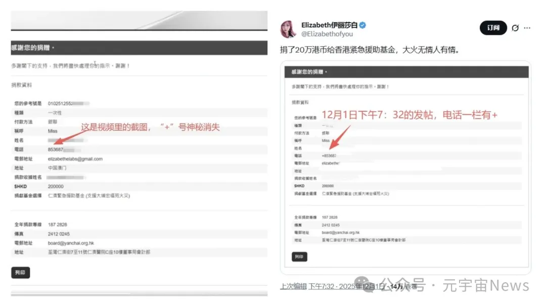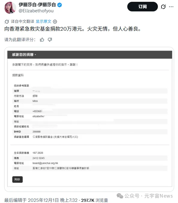 12月1日晚,币圈KOL“伊丽莎白”发布帖子,宣布已向“仁济紧急援助基金”捐款20万港元用于支援香港火灾,并附上一张捐款成功的网页截图。截图显示其电话号码为“+853687”。