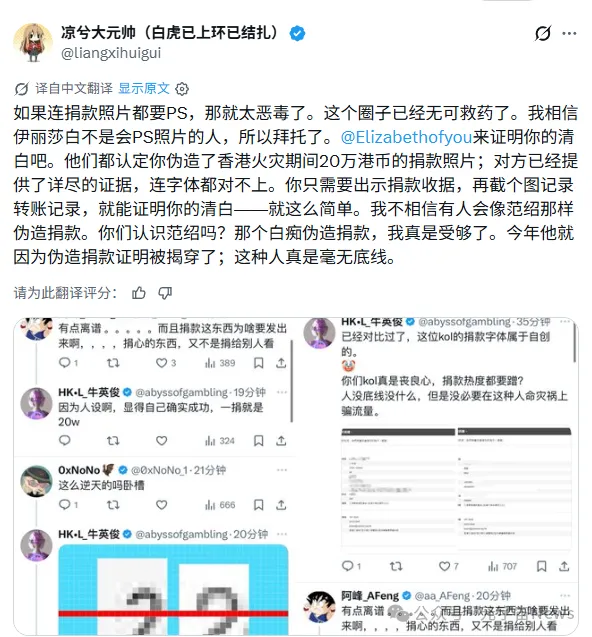 另一网友“大胖Ak”的评论则更为犀利,他列举了银行转账记录、网页刷新录屏、官方邮件回执等多种难以伪造的证明方式,并质疑道:“为什么有这么多证明方法……你选了最没用的那个(指静态截图)?”当事人回应避重就轻,舆论普遍不买账面对汹涌的质疑,伊丽莎白在12月2日凌晨作出回应,仅表示“所有善举问心无愧”,并解释视频模糊是处理隐私所致,声称不想再浪费精力自证。然而,这种回避出示转账记录等硬证据的回应,未能平息风波。许多评论联想到此前“范绍伪造捐款”的丑闻,担忧这是又一场利用公众善心的炒作。