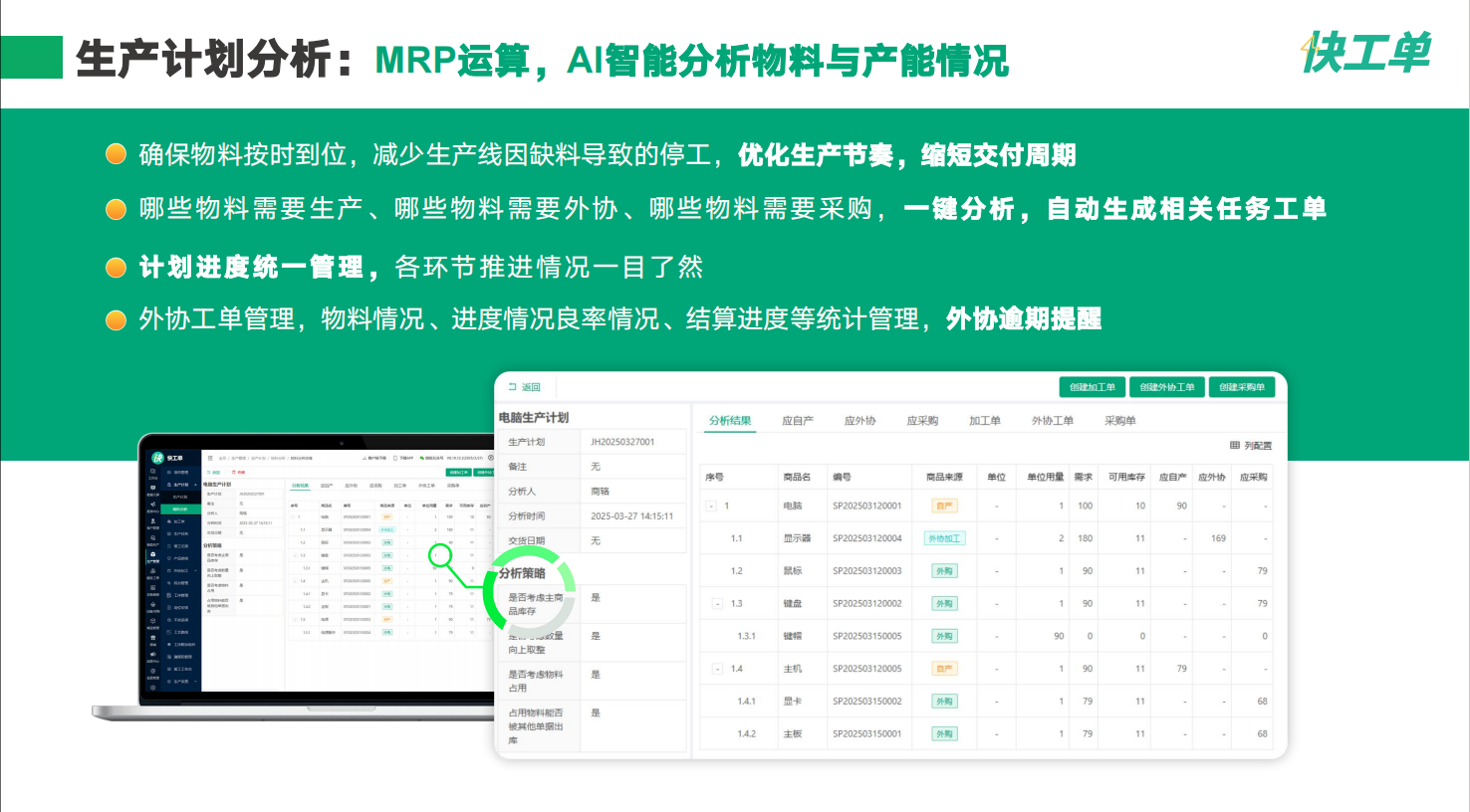 在如今竞争白热化的制造业领域,生产计划的精准把控与物料的高效调配,是企业能否抢占市场先机、实现降本增效的关键所在。快工单 MRP 物料分析,凭借 MRP 运算与 AI 智能分析的强大合力,为企业生产管理带来了革命性的变革,成为智造时代生产环节的 “最强大脑”。