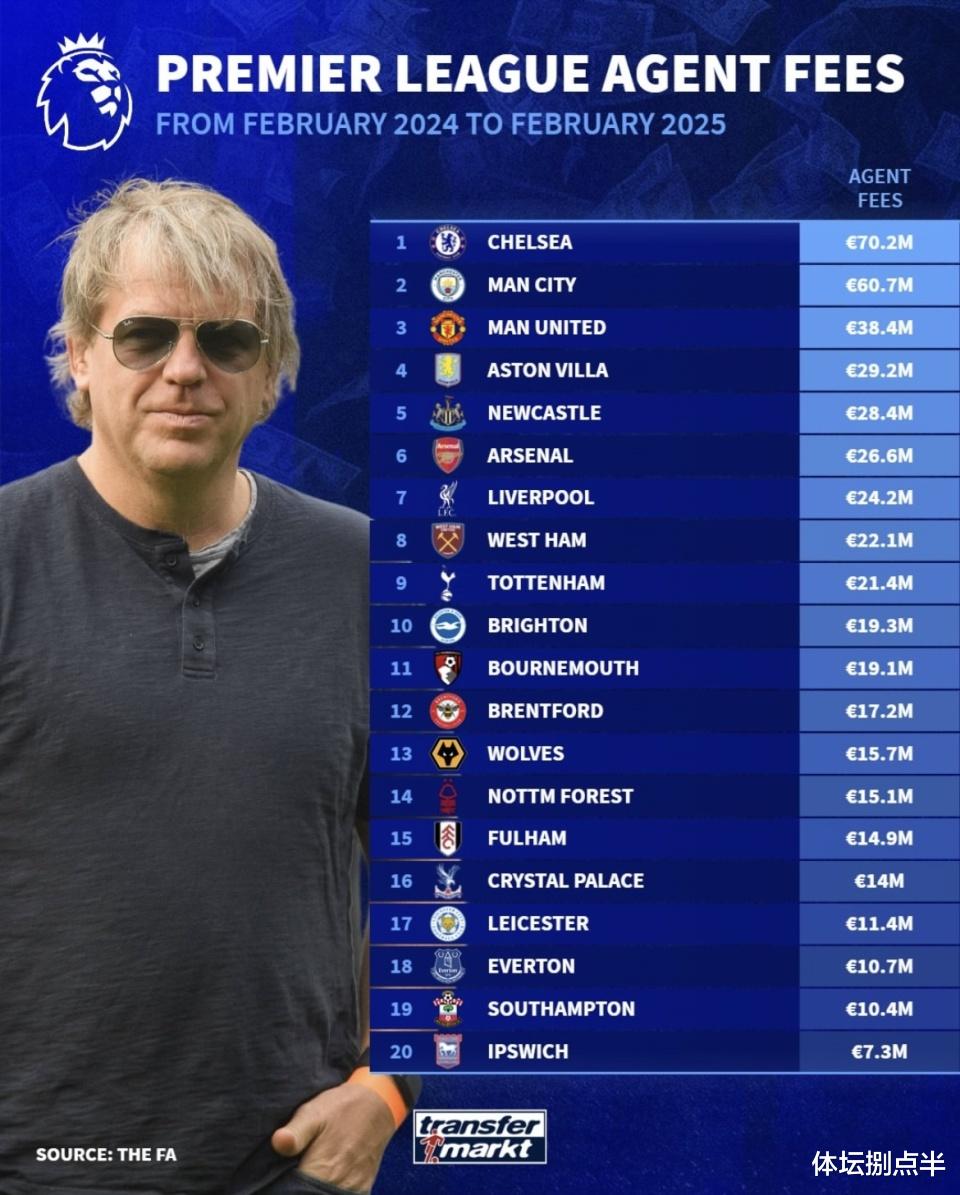 英超2024-2025经纪人费用与球队表现:谁花得值,谁在“追布置”?