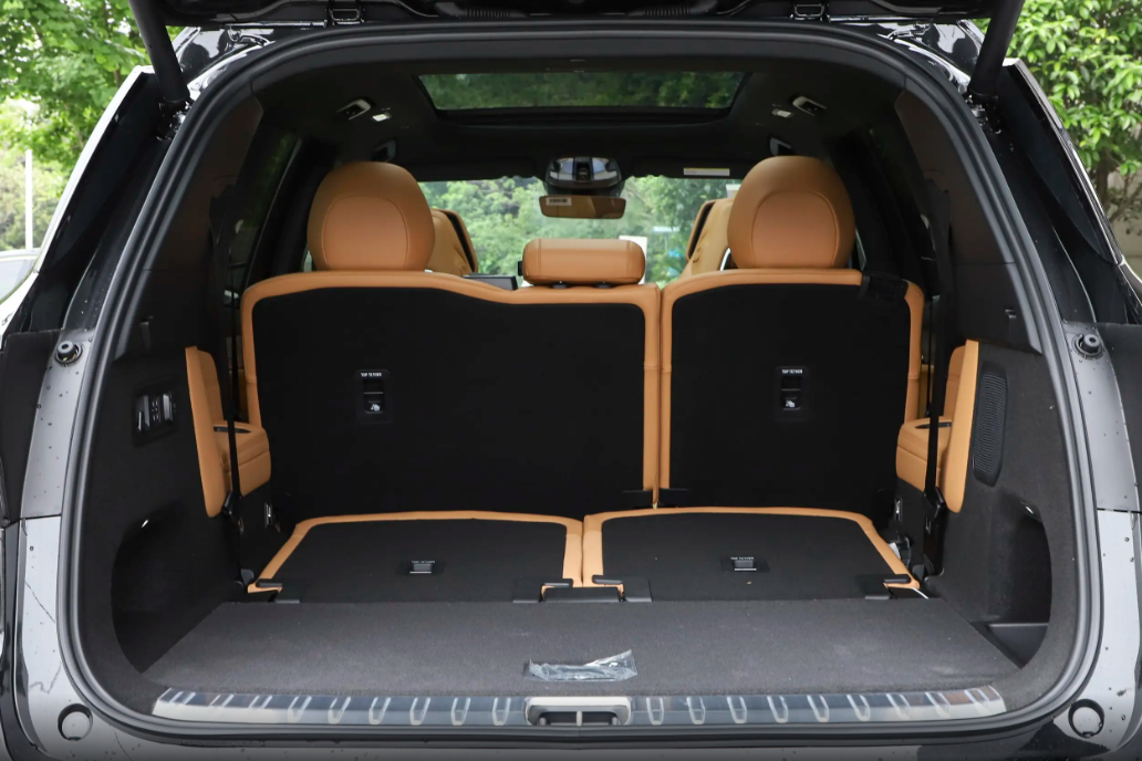 接着来看领克09的后备厢部分,这款车支持座椅灵活多变空间布局,5人同游时,第三排座椅放倒,后备箱纵深扩展至1288mm,有效容积达862L,装得下露营装备包、烧烤架、折叠桌等,轻松实现户外BBQ。7座配置下,后备箱的纵深仍可达到562mm,足以容纳大型行李箱或家庭出游的各种必需品。相较于丰田皇冠陆放等同级别车型,其装载力更胜一筹。