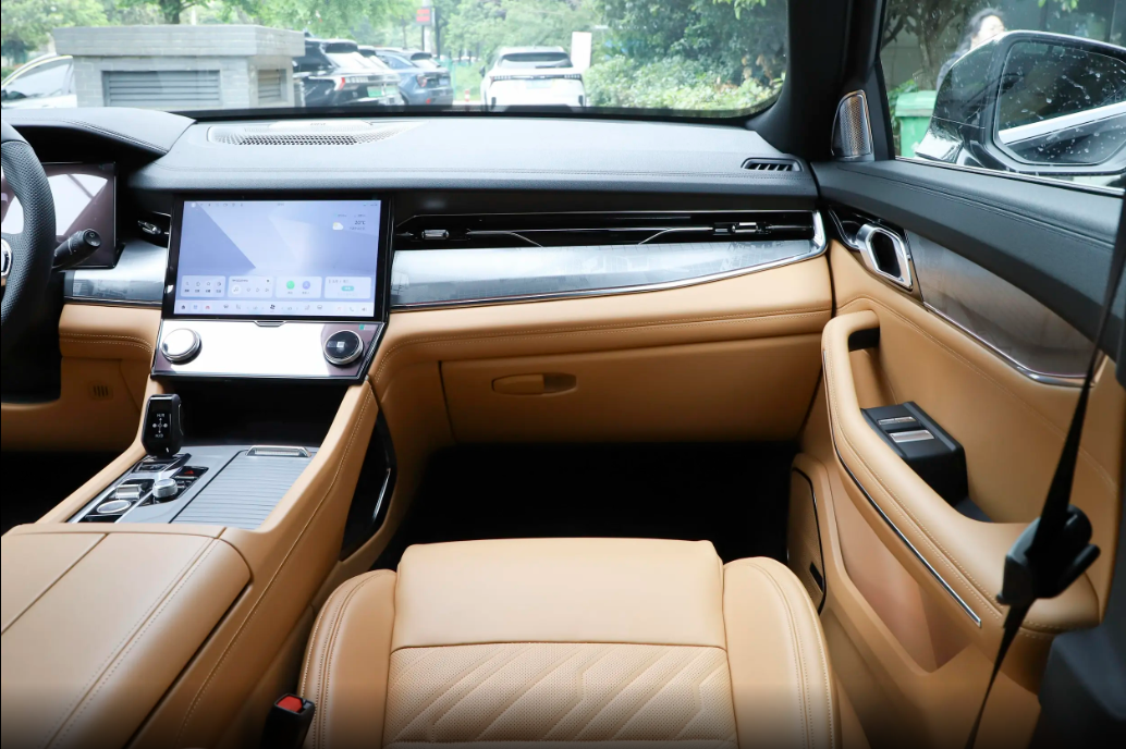 而内饰方面,领克09的座舱整体营造出简洁利落的氛围,虽然并未采用时下流行的双联屏或三块大屏设计,但内嵌式的中控屏与简约的内饰风格相搭配,视觉效果还是很新颖的。12.3英寸全液晶仪表显示效果还是非常清晰的,功能区分布和主题设计也比较大气,12英寸中控大屏支持触控操作,高通第三代骁龙汽车数字座舱平台的加持,让使用体验非常流畅。硬件配置方面,拥有5G+12G内存+128G存储,并采用高通8155芯片。空调设置区域并没有集成在中控大屏内部,为了更加方便驾驶员操作,空调面板采用了独立设计,并通过旋钮、触控等方式设置空调温度、内/外循环以及A/C功能。