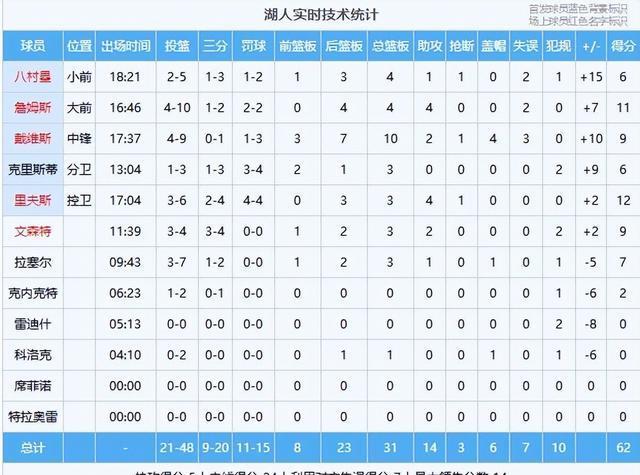 在这场比赛中,湖人队的球员们表现出色。八村塁虽然进攻端一般,但防守端表现出色;詹姆斯上半场就创下了两大NBA历史纪录,全场表现堪称完美;戴维斯则统治了内线,全场贡献21分20篮板4助攻3抢断6盖帽的豪华数据;里夫斯在下半场发挥出色,成为浓眉身边最好的帮手;文森特全场表现出色,是湖人队能赢球的大功臣。