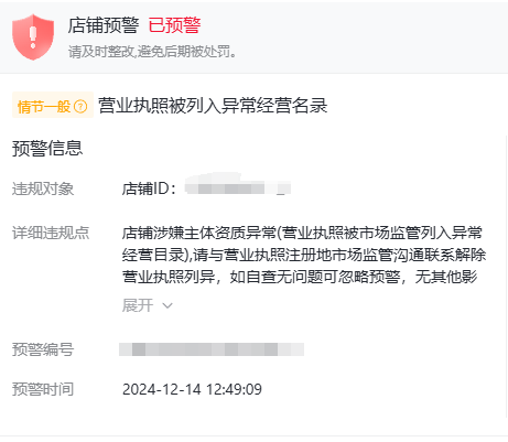 抖音小店商家在经营的过程可能会因为某些原因导致营业执照有异常,平台提示店铺预警。