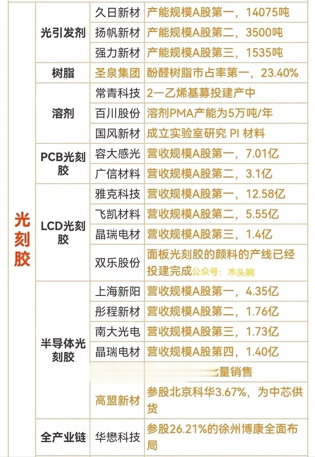 原材料端:久日新材的光引发剂产能居首,圣泉集团掌控着23%的酚醛树脂市场面板领域:雅克科技、飞凯材料在LCD光刻胶营收领跑,双乐股份的颜料产线已建成半导体高端战场:上海新阳、彤程新材、南大光电在半导体光刻胶领域形成第一阵营,容大感光更实现I/G线胶批量销售全链布局者:华懋科技参股的徐州博康,正构建从树脂到光刻胶的完整生态