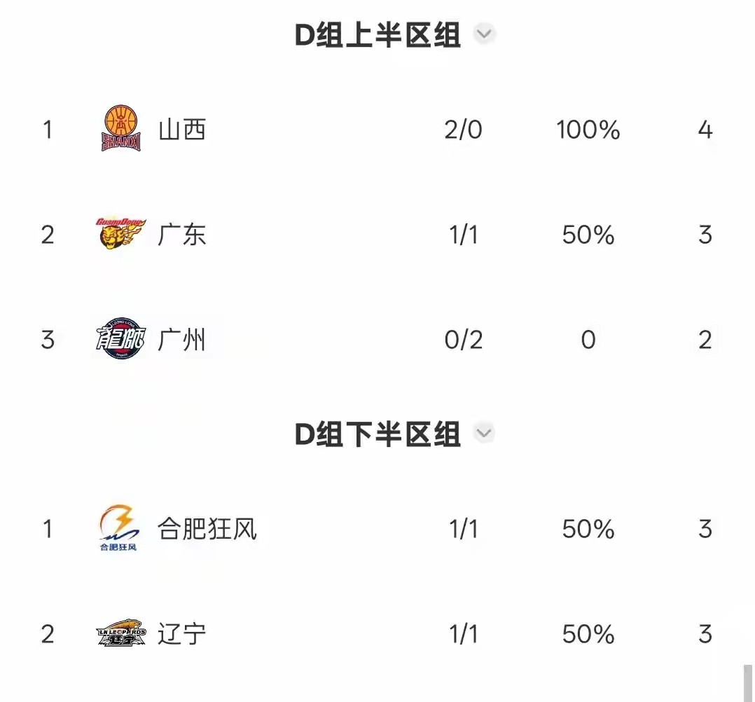 广东东阳光男篮负于山西汾酒男篮后,大比分击败了同城广州郞汰海本男篮,以一胜一负排在D组上半区第二。广州郞汰海本男篮连续负于山西汾酒男篮和广东东阳光男篮后,以两负的成绩排在D组上半区第三。
