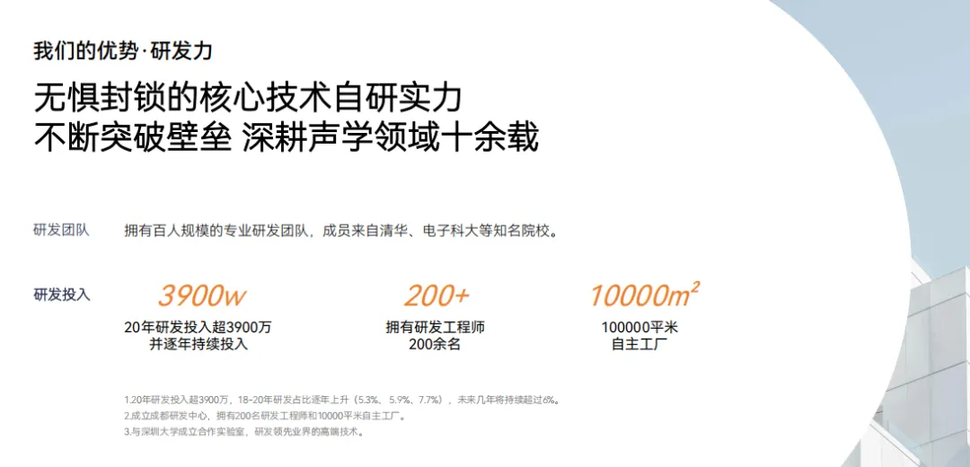 研发投入:拥有占地10000平方米的研发生产基地,超100人的专业声学团队(含博士、硕士技术骨干),年研发投入占比超15%。