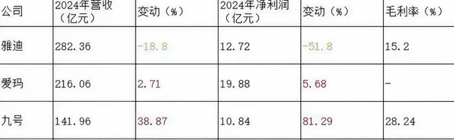 电动自行车和电动踏板车是雅迪最核心的两大产品线,2024年分别贡献了43.4%和25.1%的收入,而爱玛的主要产品除电动两轮车外,还有电动三轮车,2024年爱玛电动三轮车营收19.52亿元,同比增长36.07%,毛利率为22.44%,远高于全年的17.76%,成为公司毛利率最高的产品,也成为爱玛的差异化优势。脱胎于小米生态链的九号,产品矩阵更为丰富,智能电动平衡车、智能电动滑板车、服务机器人、全地形车,覆盖了2000元入门级到万元旗舰。相比之下, 雅迪单一的产品线,影响到了市场竞争能力。