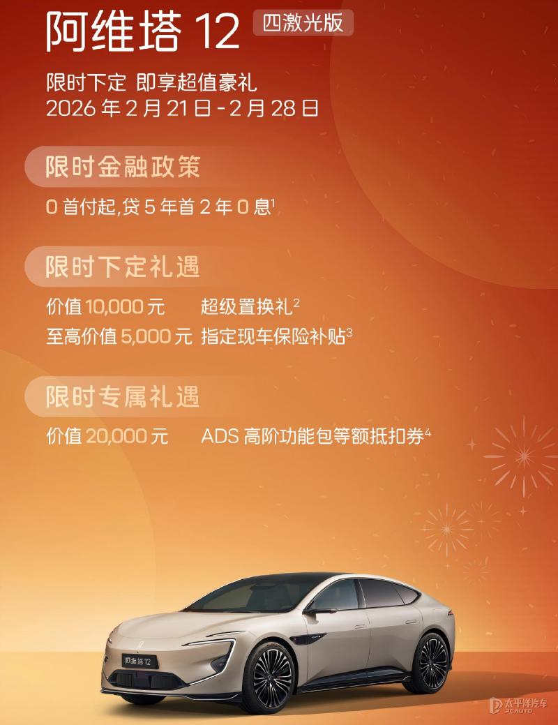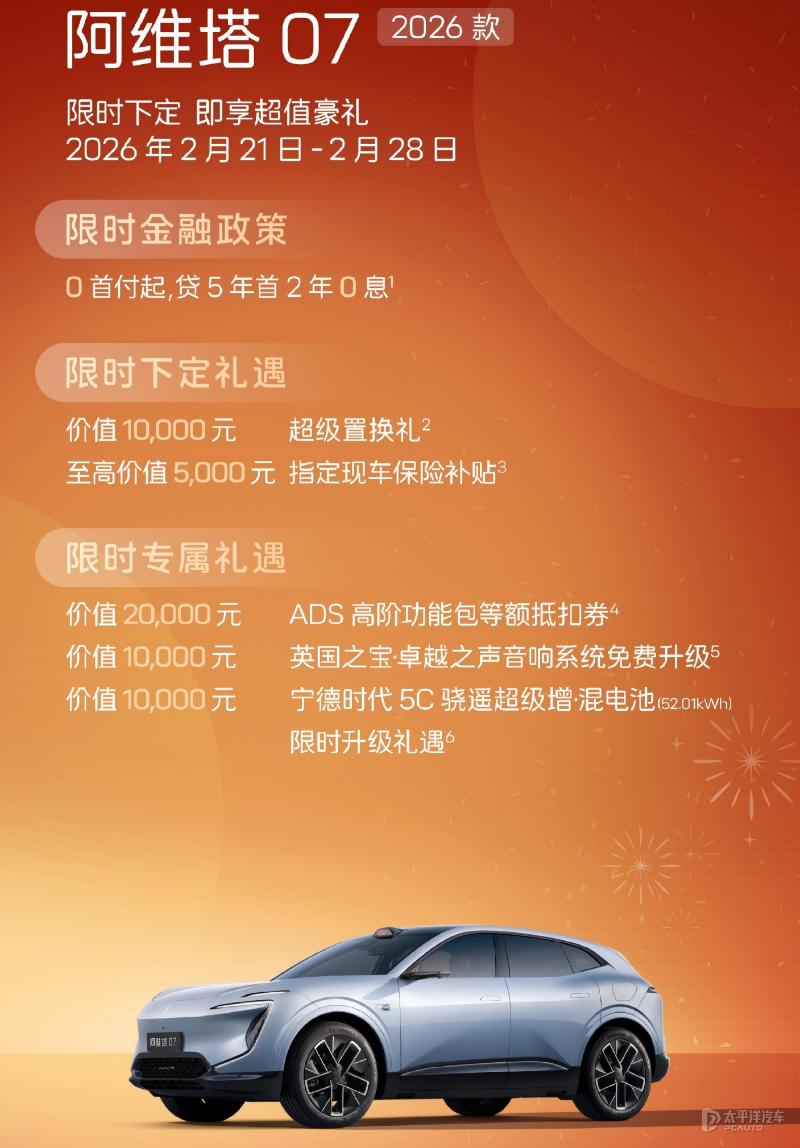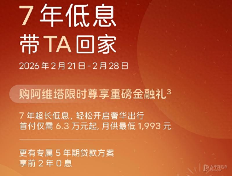 【太平洋汽车 汽车动态】近日,阿维塔宣布推出重磅限时金融礼遇,即日起至2月28日,消费者下定阿维塔旗下多款车型,即可享受7年超长低息金融方案,月供低至1993元。