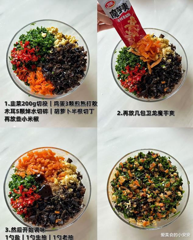 1、韭菜:200克、鸡蛋:3个、木耳:一把、胡萝卜:半根、小米辣:2根(可选)、魔芋爽:2包(可选)
