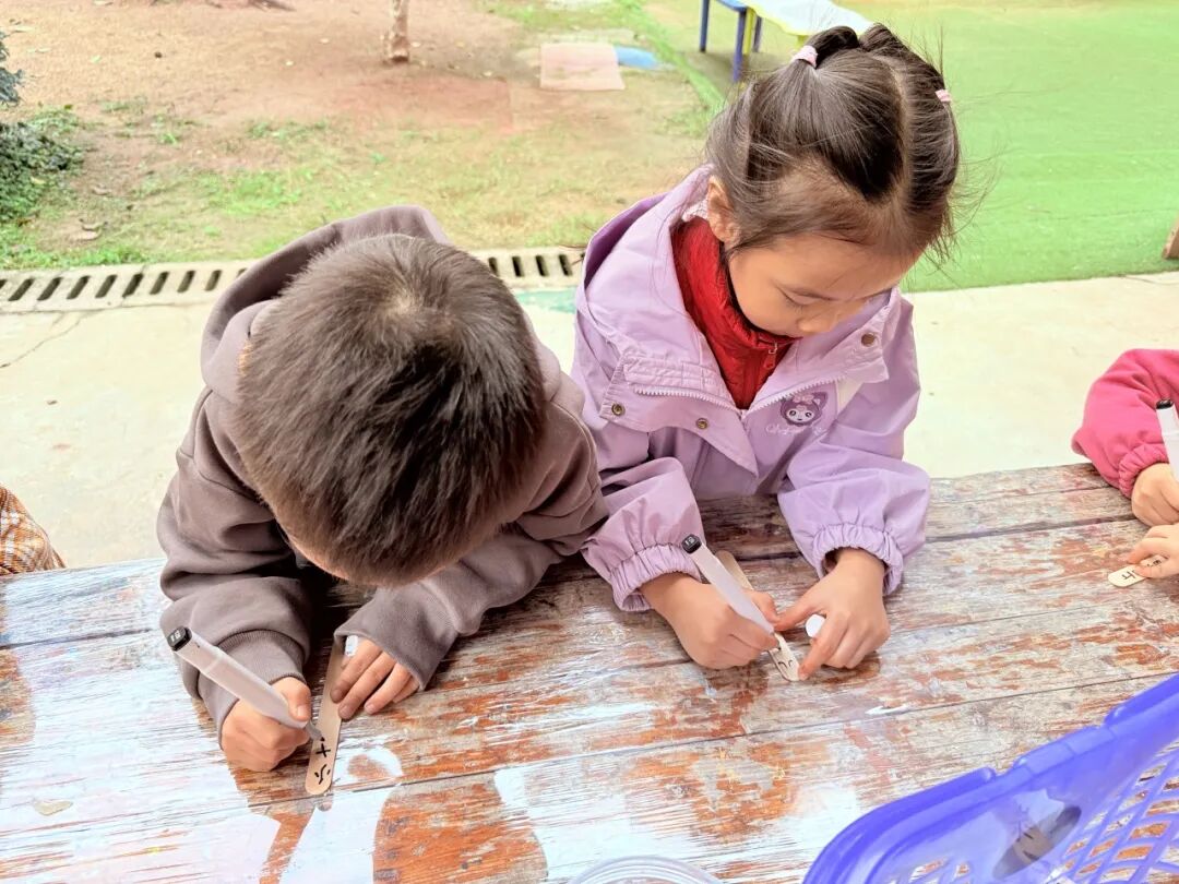 户外自主游戏时间一到,木工坊就成了孩子们的“秘密基地”。这一次,他们要挑战一个特别的任务——制作古代的“书本”:简牍