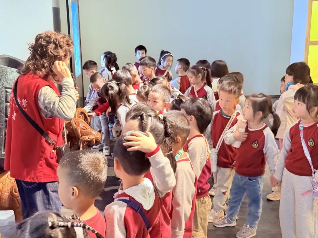 孩子们一边听,一边看,时不时还用小手指着展品,向老师和同伴分享自己的发现。跟随讲解员的脚步,我们还倾听了“编铙”的乐声,孩子们随着讲解员敲打的节奏哼起了音调。