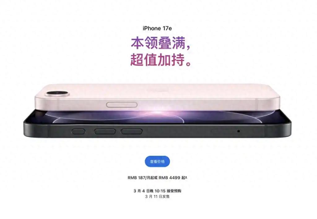 iPhone 17e 的外观没有变化,最受关注的三点包括——A19 芯片升级、MagSafe 回归、起步容量提升至 256GB。更重要的是,售价维持 4499 元不变。其他的依旧没有变化,依然是 6.1 寸的刘海屏、60Hz OLED 显示屏、比 6.3 英寸 iPhone17 略小。